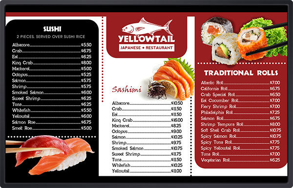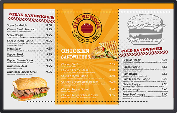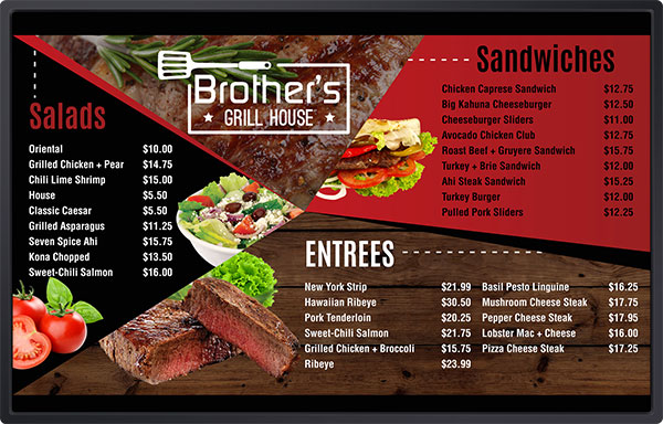 Οι εικόνες και τα μηνύματα υψηλής επίπτωσης στη νέα πλακέτα ψηφιακών μενού (είτε τα τοποθετείτε στο λόμπι του εστιατορίου σας είτε σε μια οθόνη πίσω από τον πάγκο) θα αυξήσουν τις πωλήσεις και θα μειώσουν το επιπλέον κόστος, όπως στατική σήμανση και εκτύπωση. Η εμπειρία των επισκεπτών σας στο κατάστημά σας θα βελτιωθεί σημαντικά, ανεξάρτητα από την τοποθεσία ή τον τύπο της επιχείρησής σας.